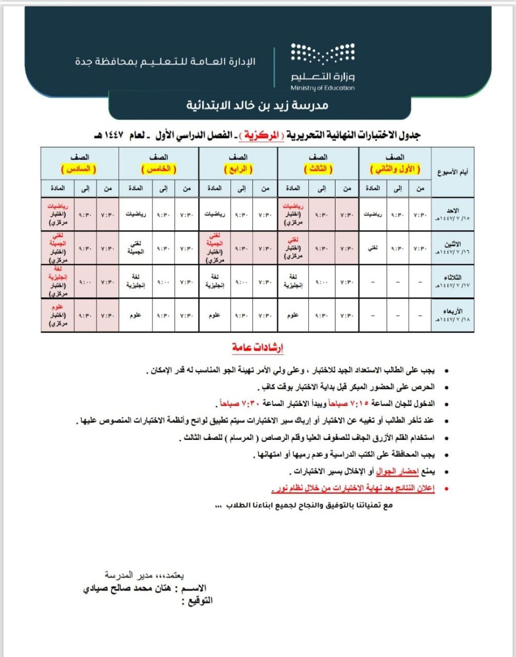 جدول الاختبارات التحريرية والمركزية للفصل الدراسي الأول ادارة جدة